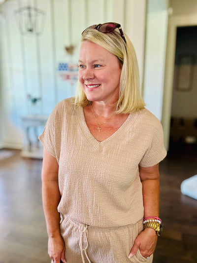 V-Neck Crinkle Short Sleeve - Tan
