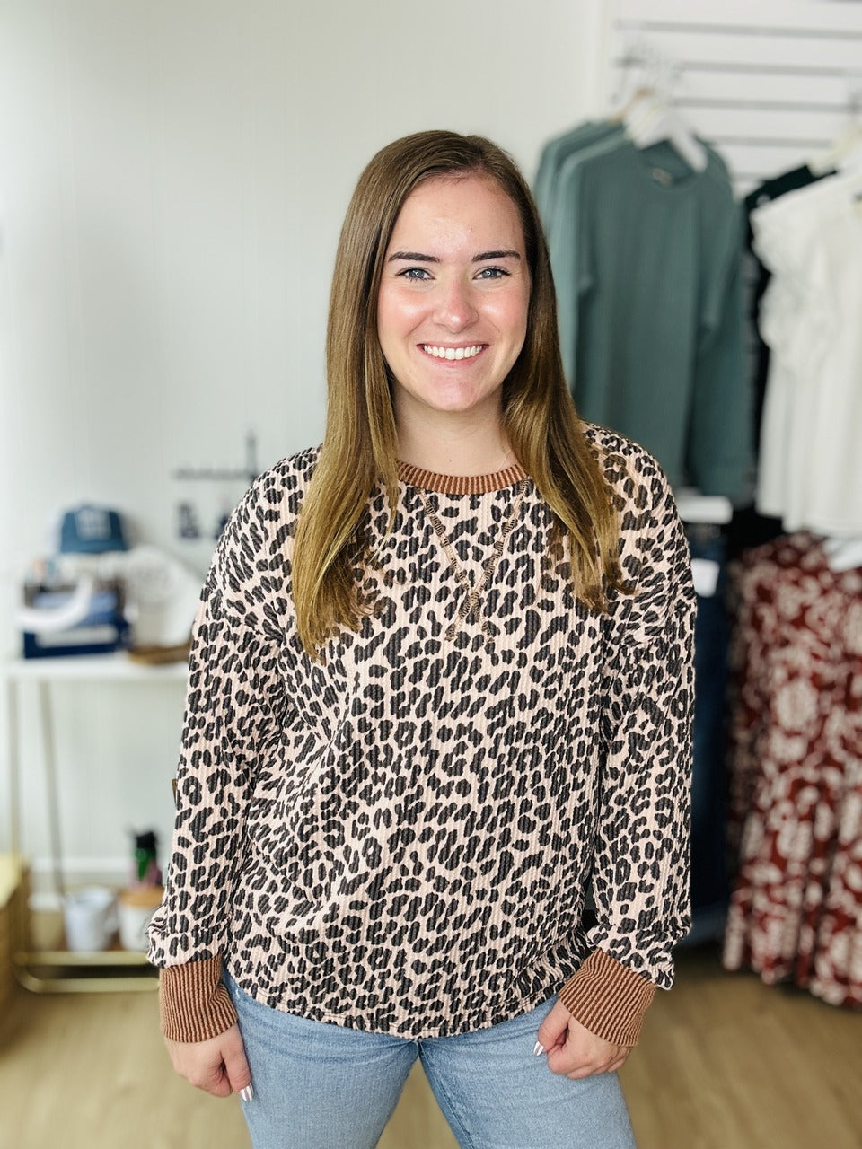 A rib animal print top featuring a solid rib contrast, exposed stitch, drop shoulder, long sleeves, and a relaxed fit. (each one is unique)