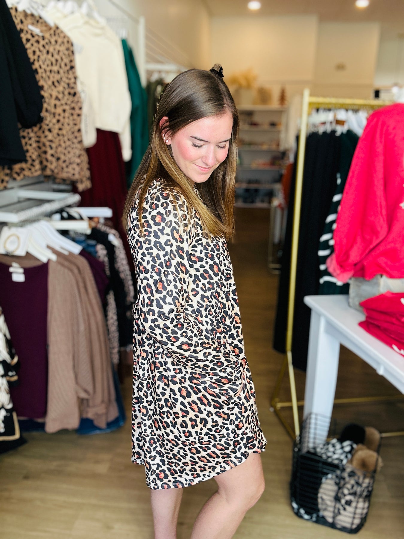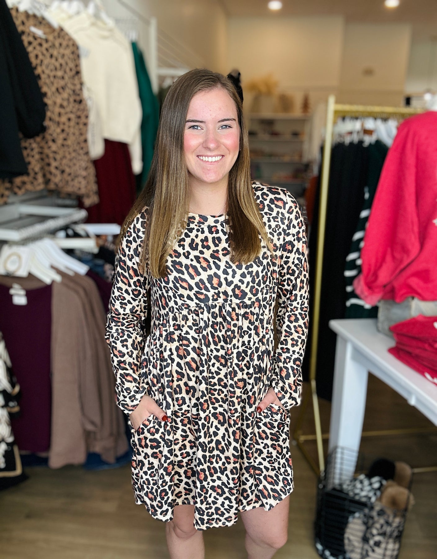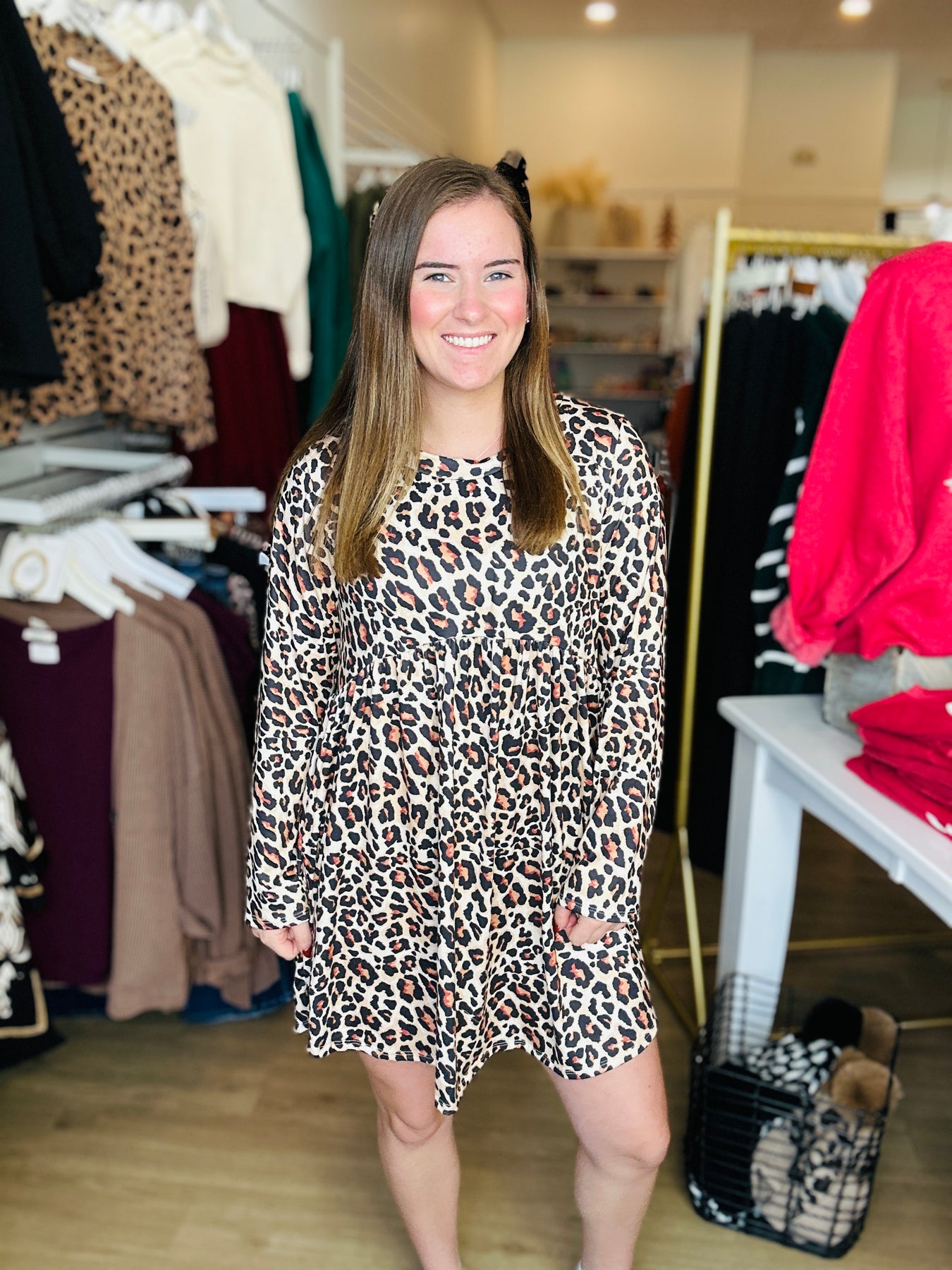 LEOPARD ANIMAL PRINT ROUND NECK LONG SLEEVE BABYDOLL FIT AND FLARE SWING KNEE LENGTH KNIT DRESS WITH SIDE POCKETS