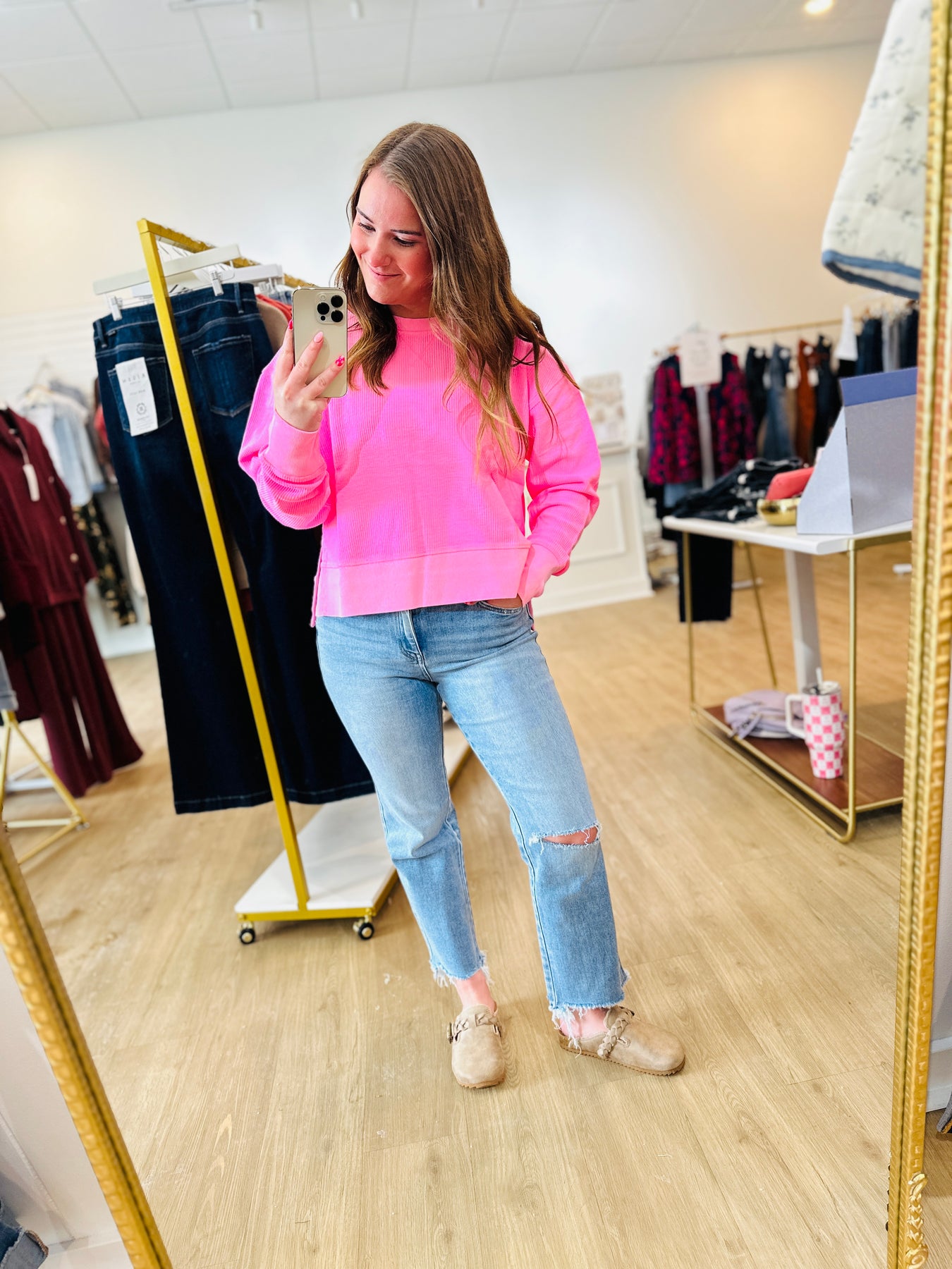 COMFORT STRETCH DENIM, HIGH RISE WAIST, 5 POCKETS, DISTRESSED RIGHT KNEE DETAIL, UNEVEN RAW HEM, ANKLE LENGTH, LIGHT WASH, STRAIGHT JEANS