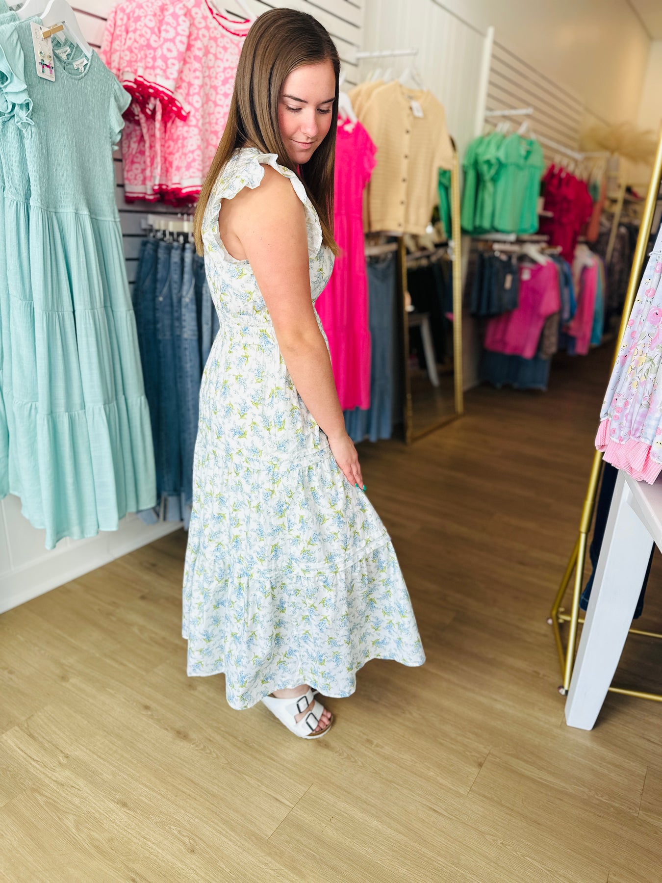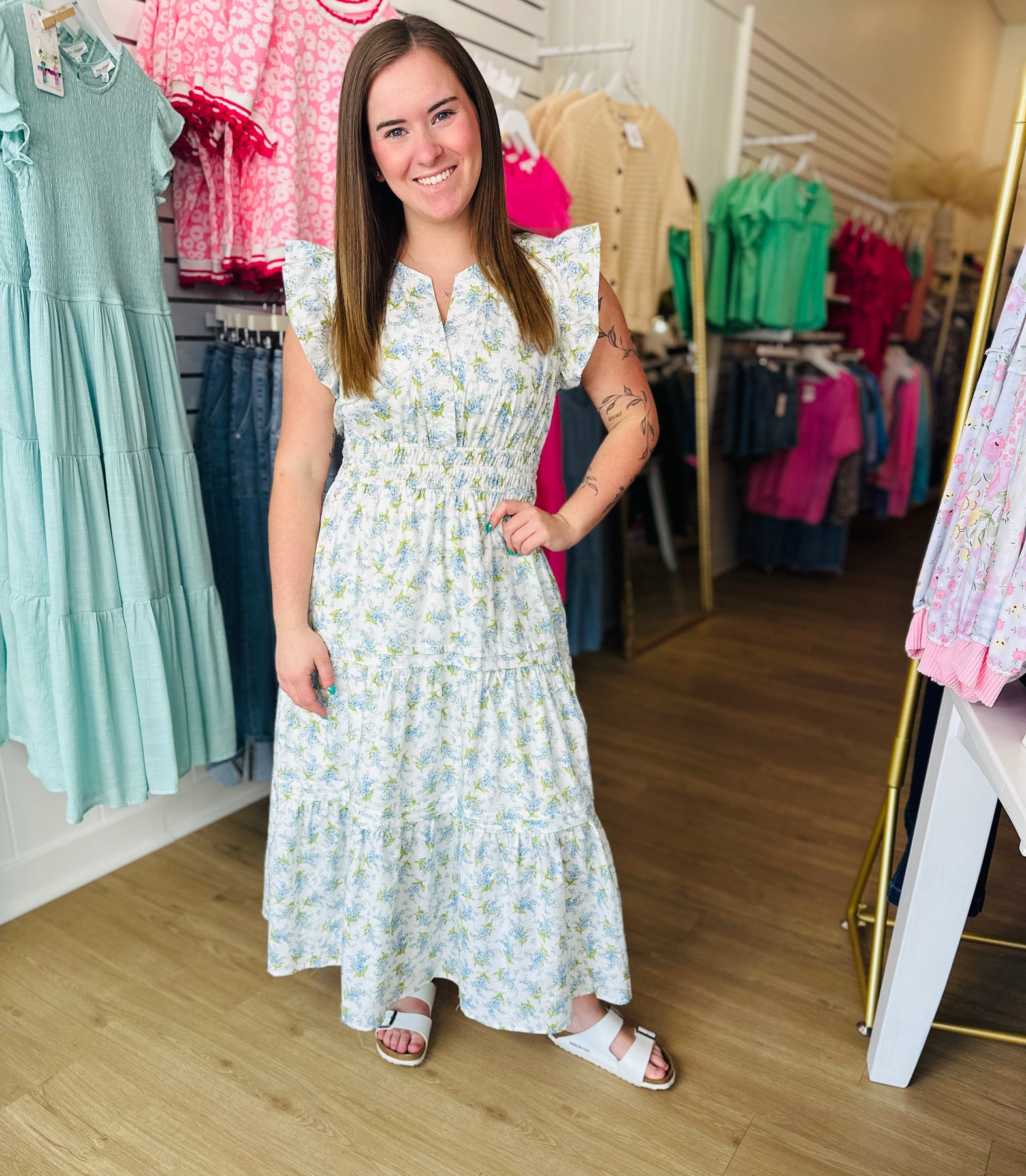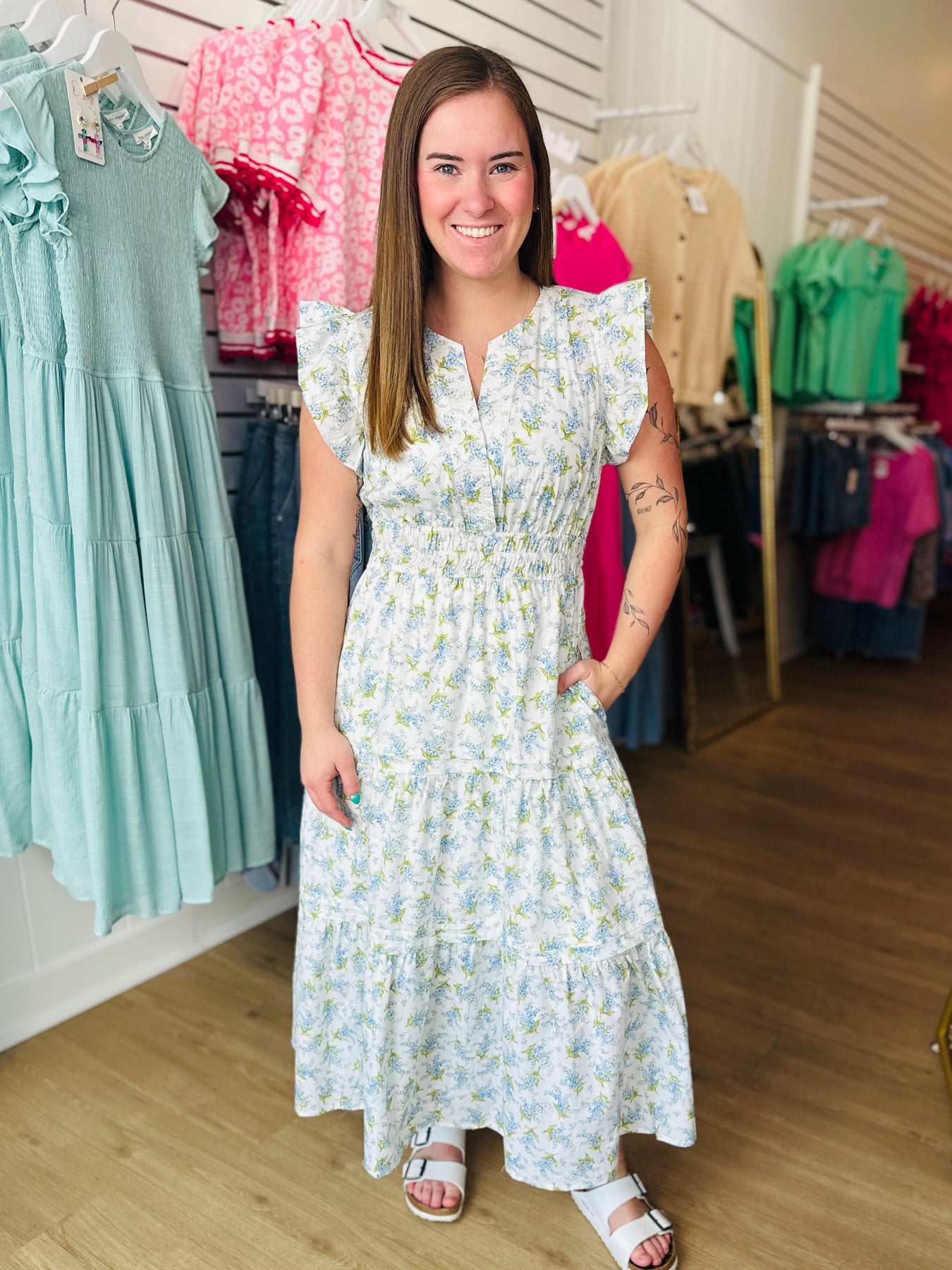 RUFFLE SLEEVE FLORAL WOVEN PRINT TIERED DRESS WITH POCKETS