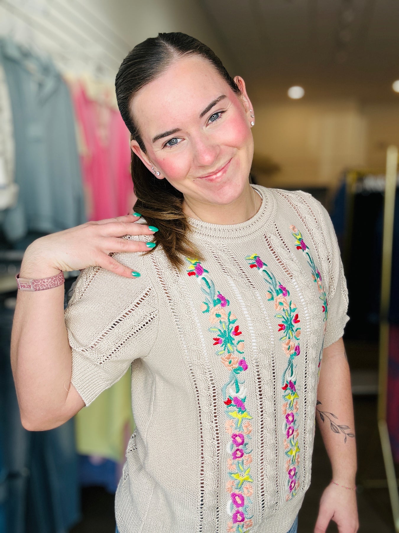 Beautiful, embroidered cable knit short sleeve just in time for the warmer days ahead.