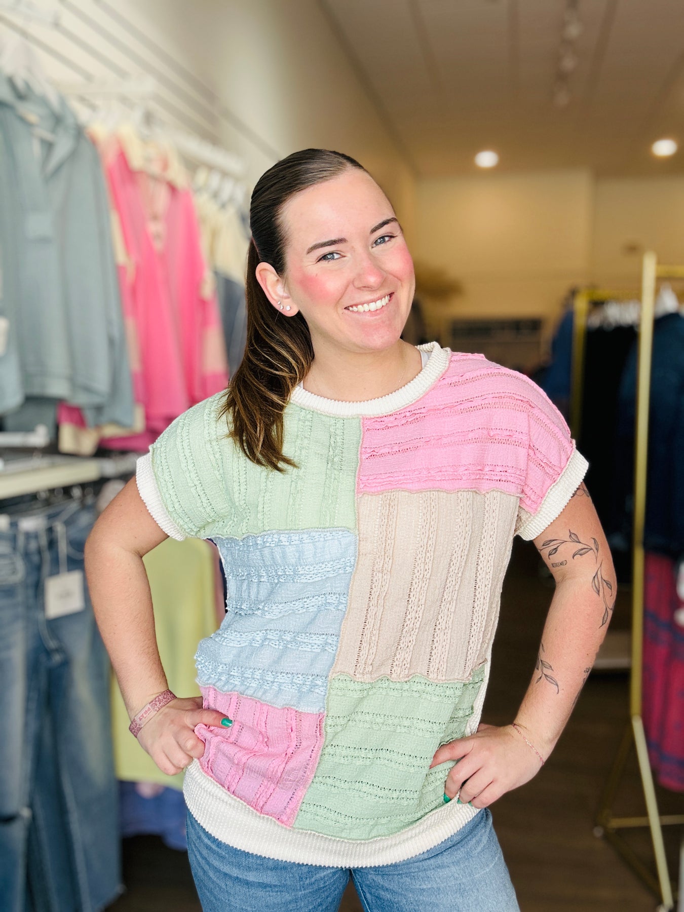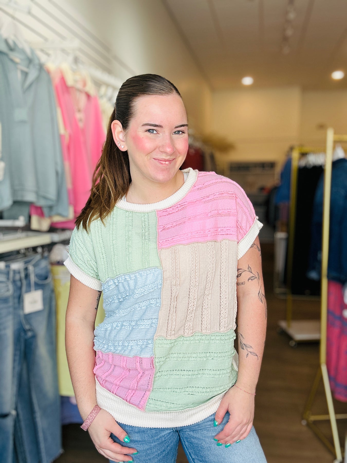 Short-sleeve knit top featuring textural colorblock patchwork and a banded hem