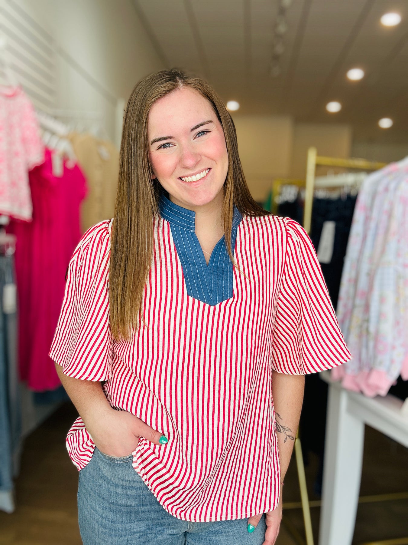 STITCHED NECK BAND FLUTTER SHORT SLEEVE VERTICAL PIN STRIPE WOVEN BLOUSE