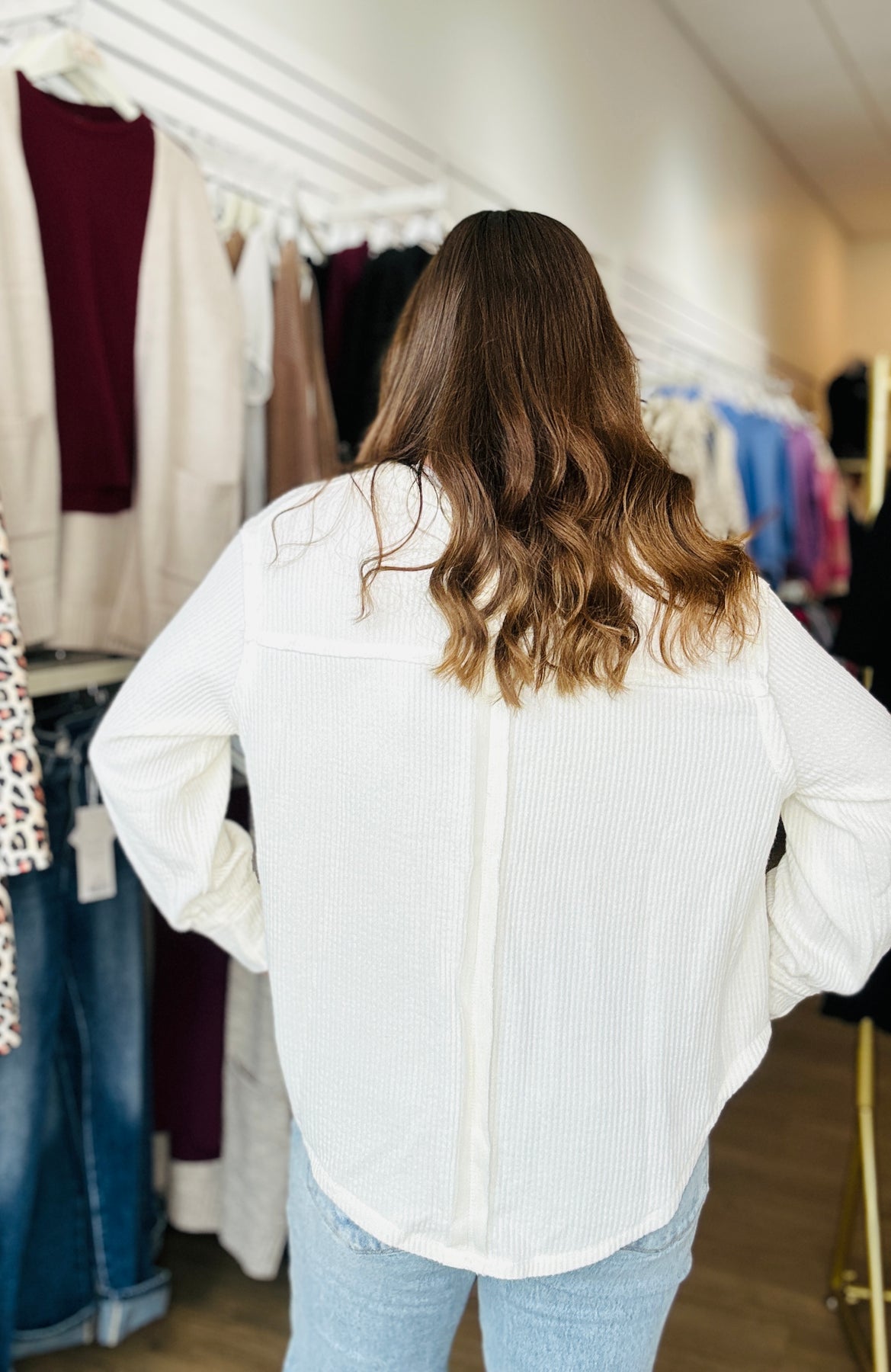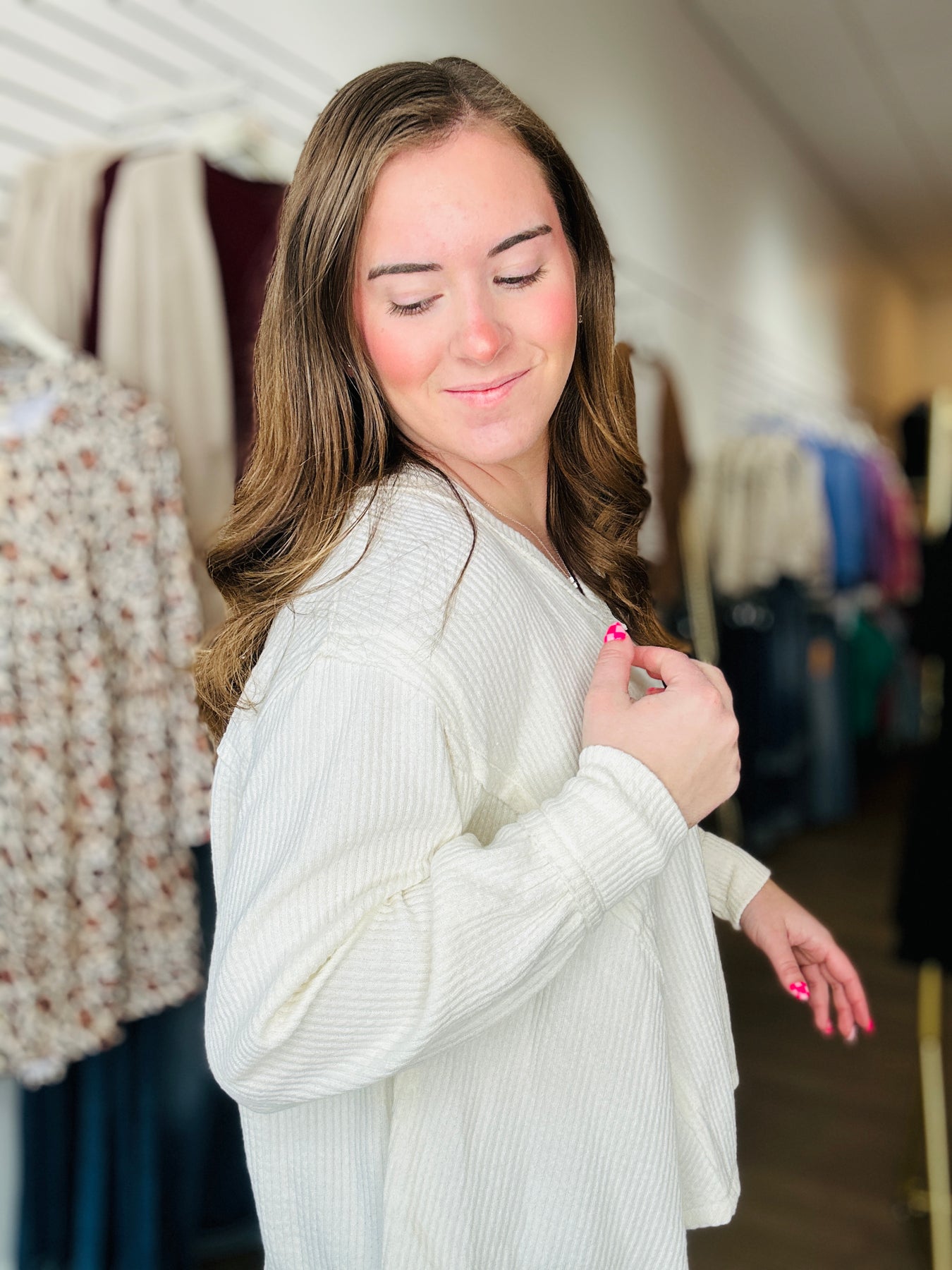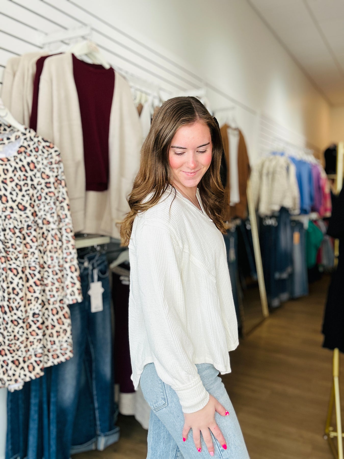 This V-neck top features exposed seam detailing, subtle underarm pintuck accents, and a flattering asymmetrical hem that gives it that modern, effortless look. The soft fabric is cozy and looks a little more elevated — perfect for dressing up or keeping casual. It’s one of those “throw it on and feel put together” pieces you’ll reach for again and again.
