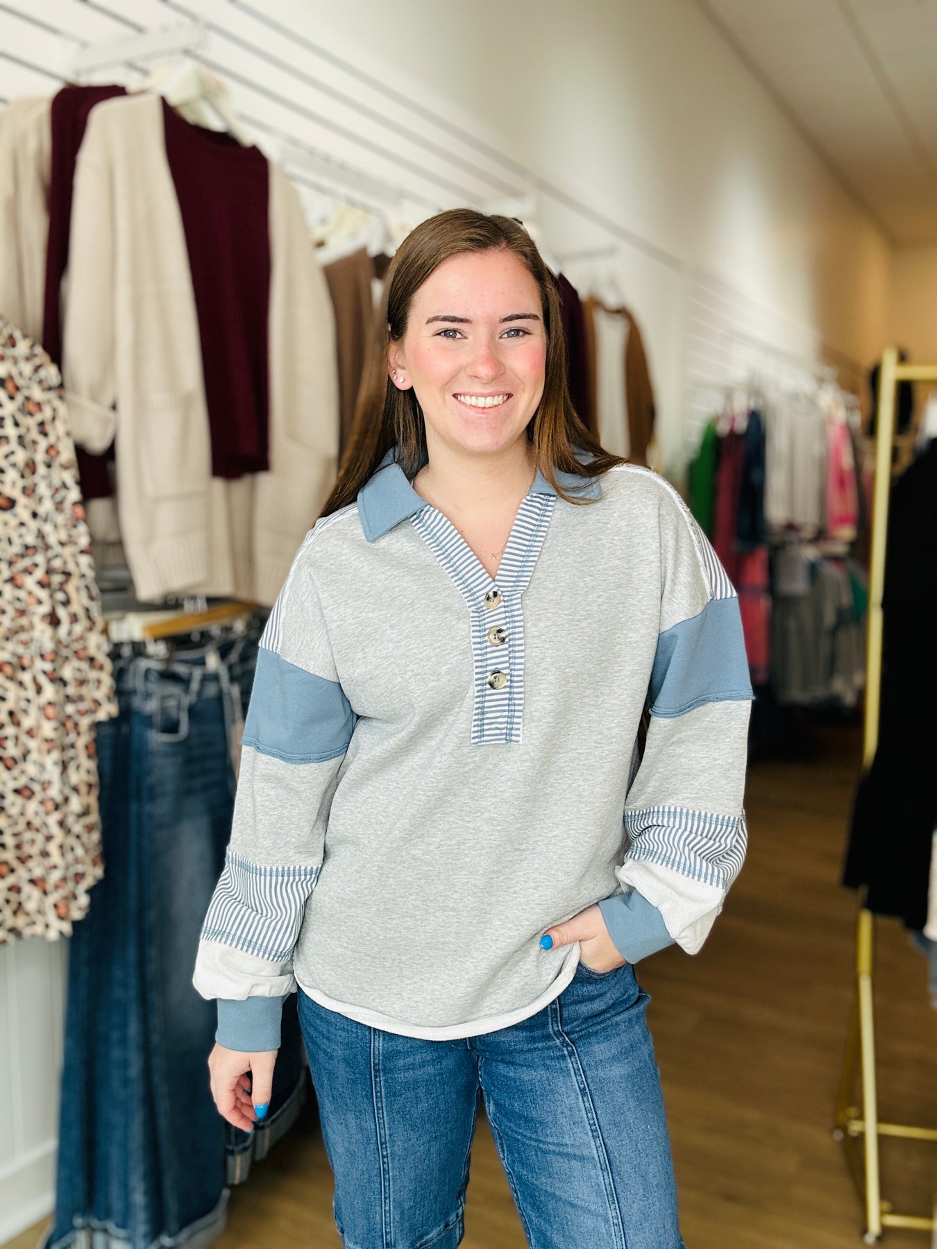 Color Block Oversized Casual Knit Top - Early Autumn Long Sleeve Knit Top with Raw Edge Detail - Comfy Early Fall Button Down Knit Top - Drop Shoulder - Round Hem