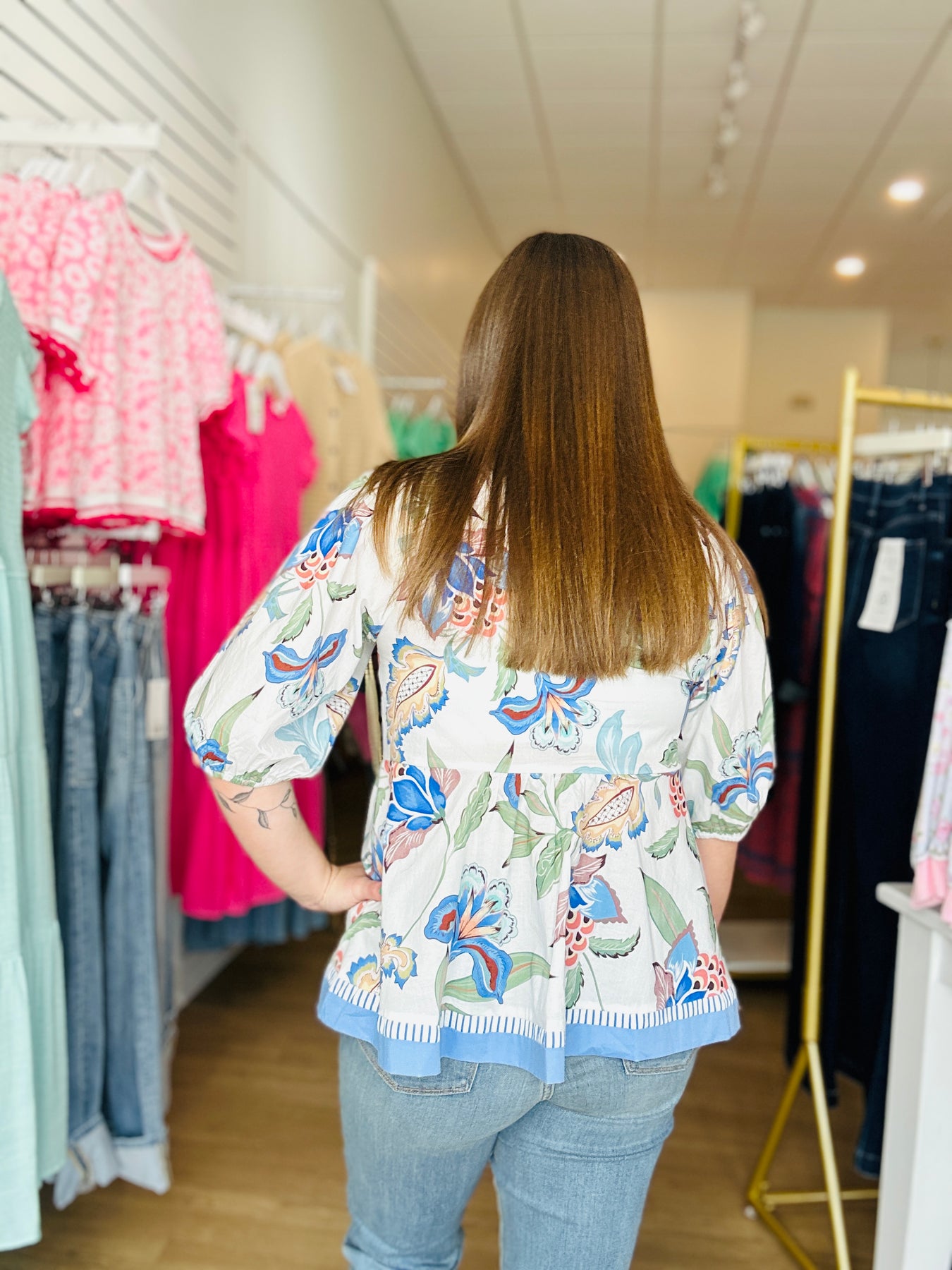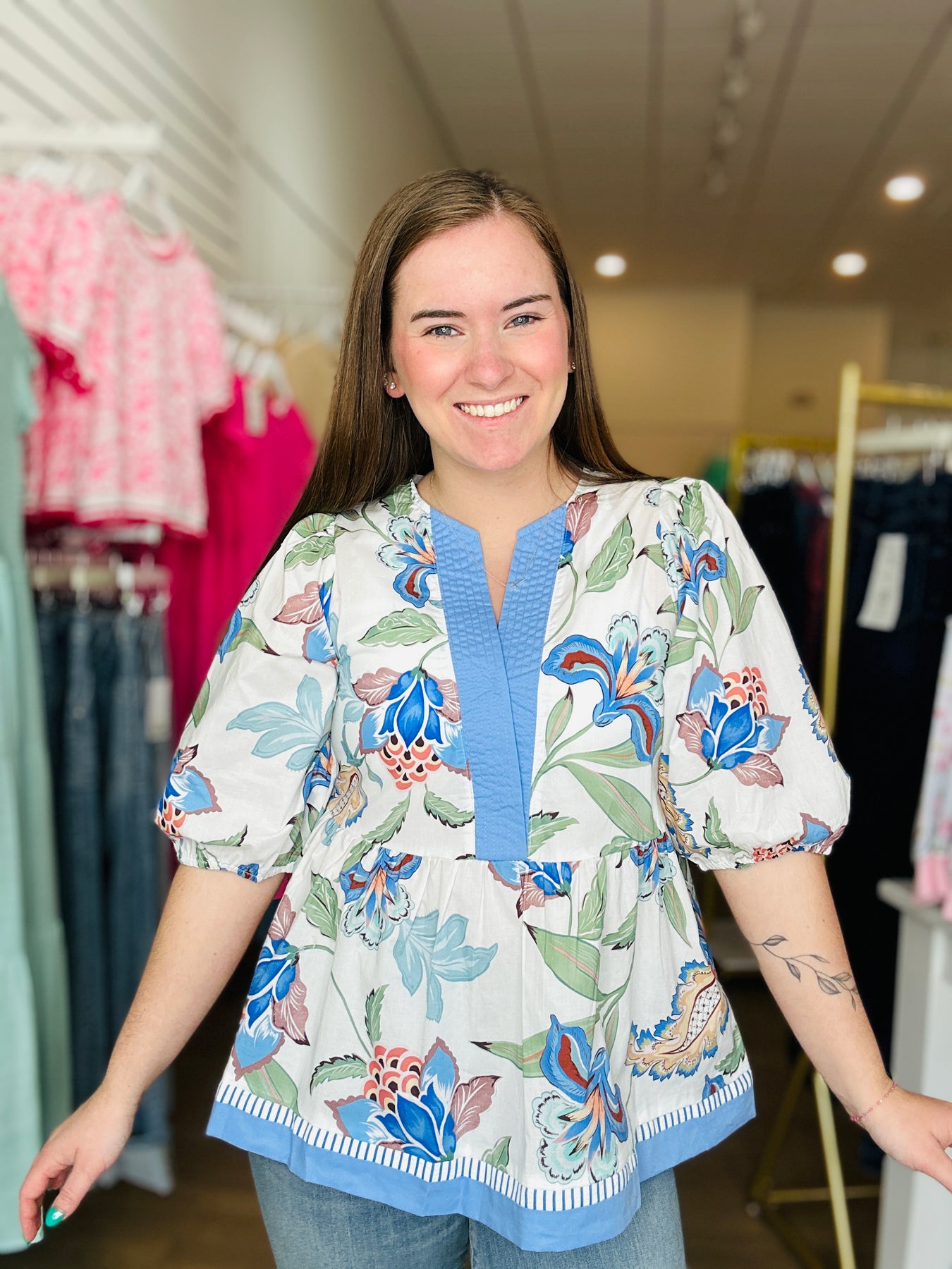 HALF SLEEVE WOVEN PRINT TOP WITH CONTRAST AND STITCHING DETAIL MODEL IS 5'8" AND WEARING SIZE SMALL