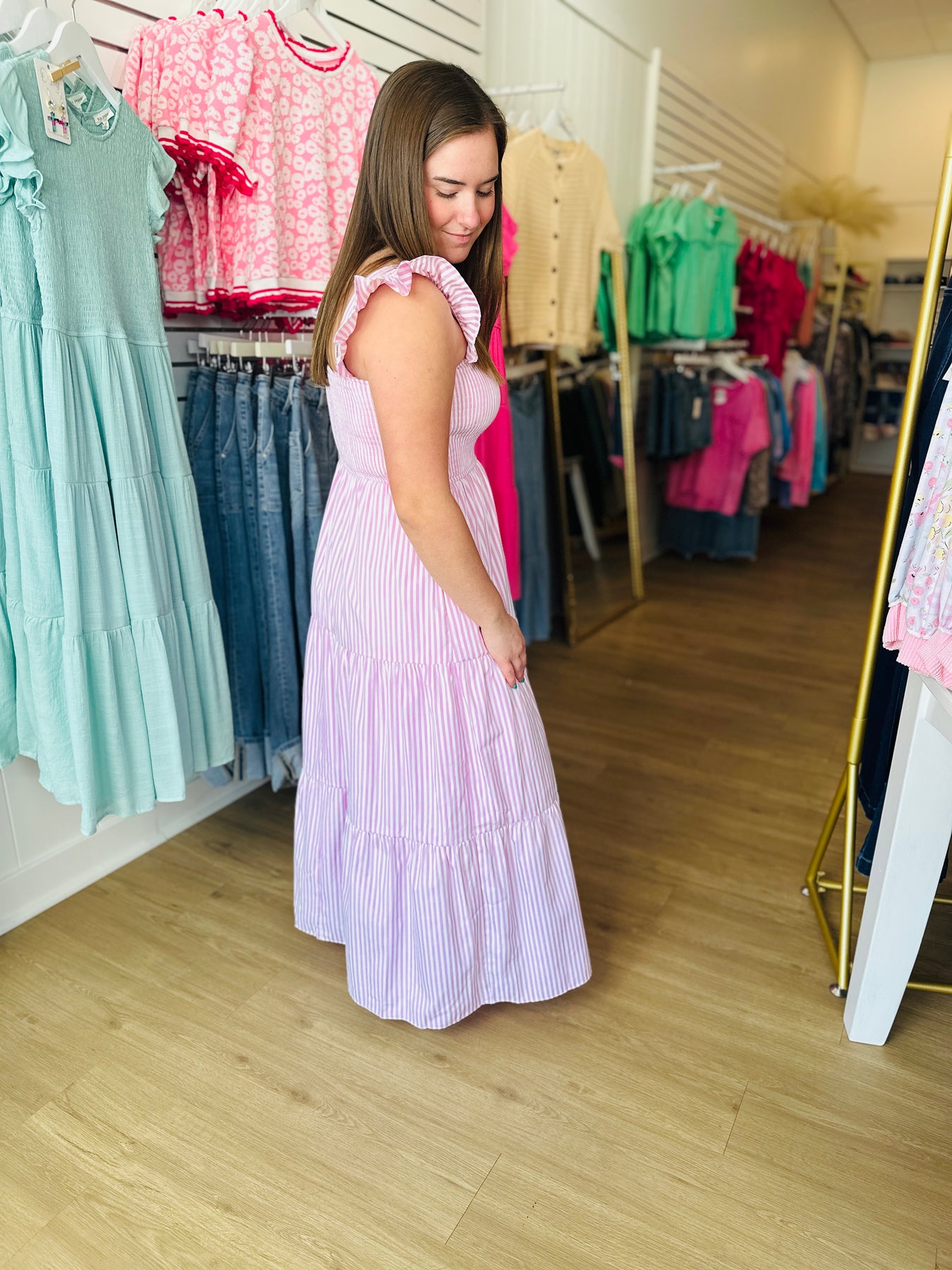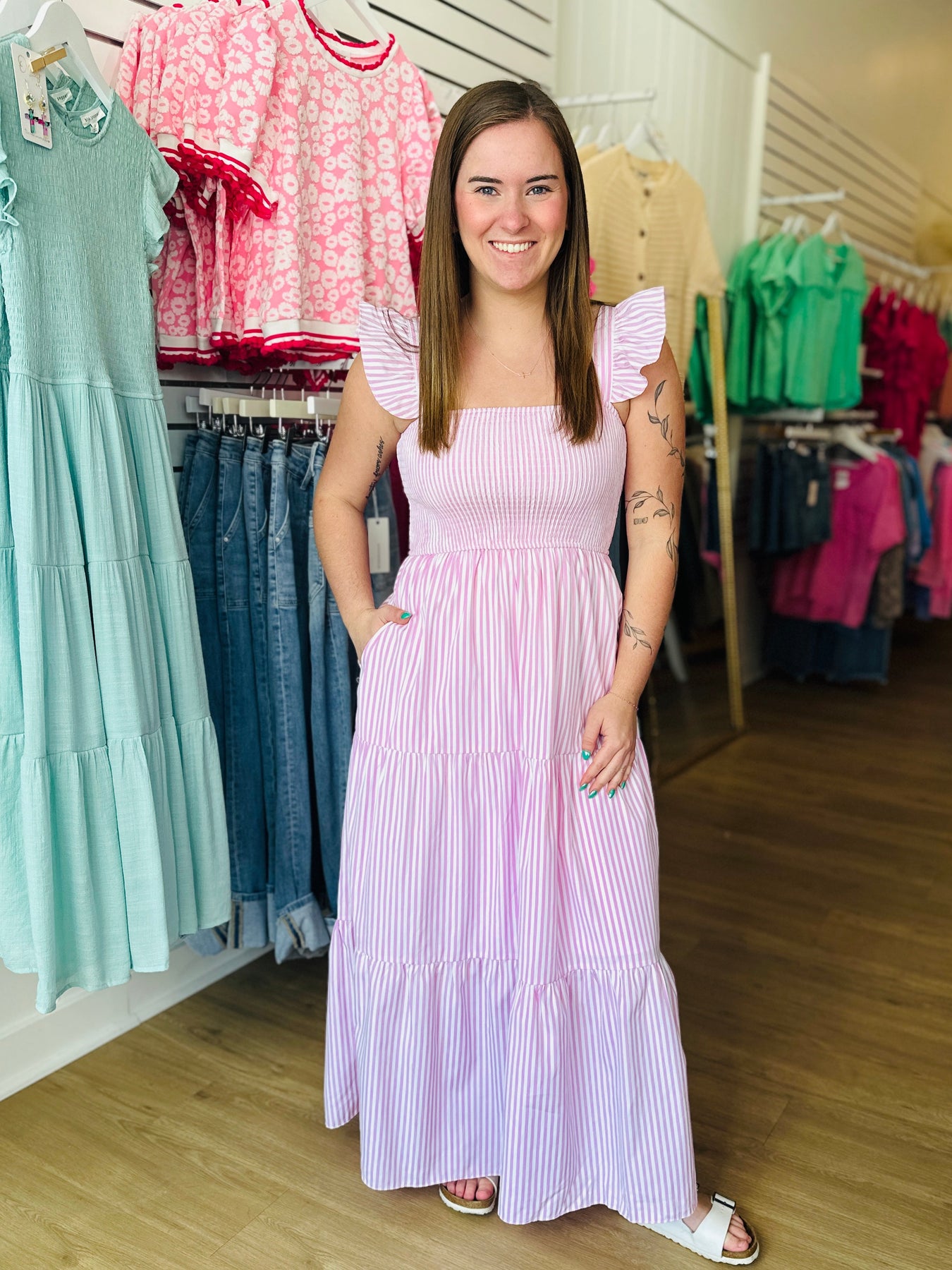 RUFFLED SLEEVE SQUARE NECK WOVEN STRIPE SMOCKED TIERED MAXI DRESS WITH LINING AND POCKETS MODEL IS 5'2 AND WEARING SIZE SMALL