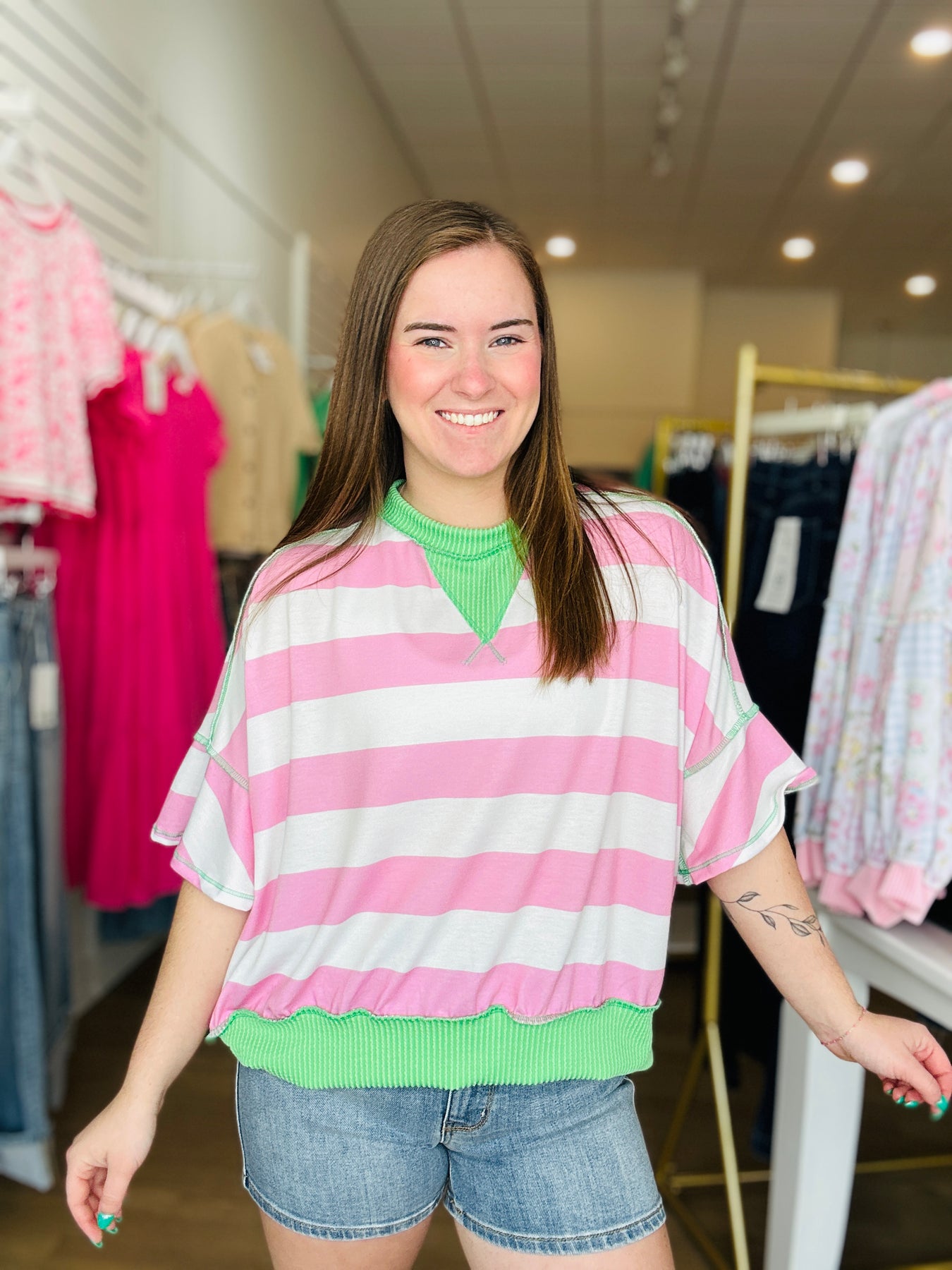 Oversized striped crewneck style short sleeve. Fabric: